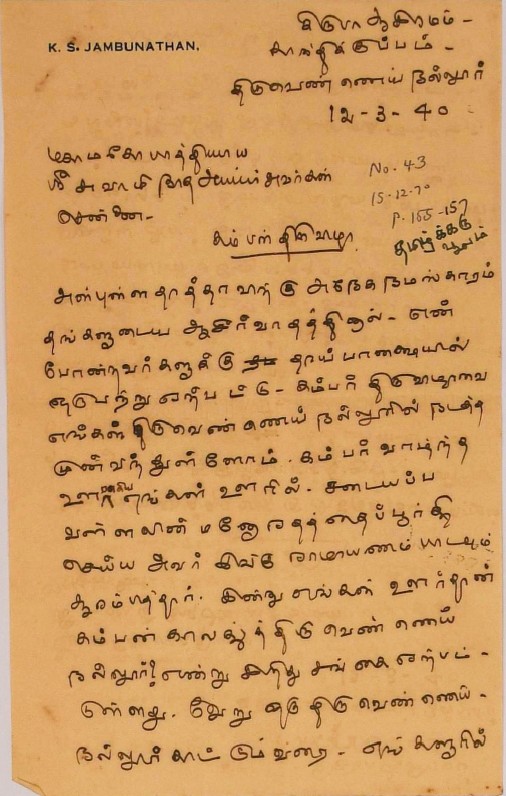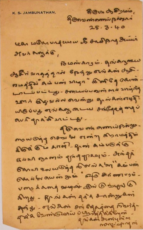 கம்பர் விழா : ஐயரின் உடல்நலக்குறைவு, கம்பர் விழா பற்றிய மடல் ஏப்ரல் 3, 1942