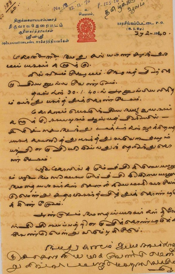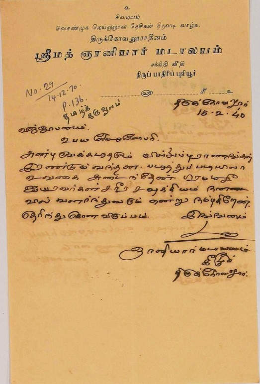 சாமிநாதையர் கடிதங்கள் : உ.வே.சாமிநாதையருக்கு வந்த கடிதங்களை வகைப்படுத்தி வைத்தல் பற்றிய மடல் சூலை 9, 1942