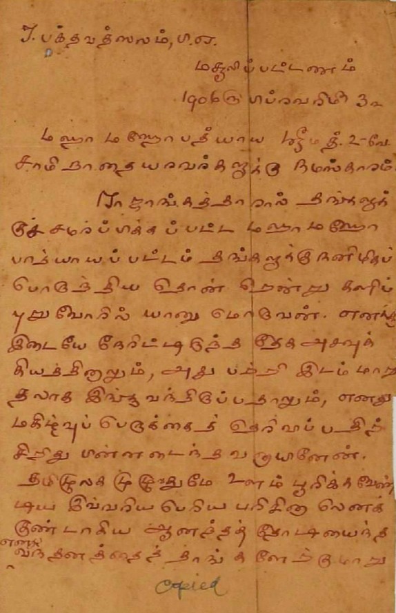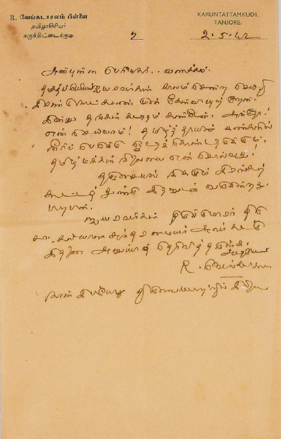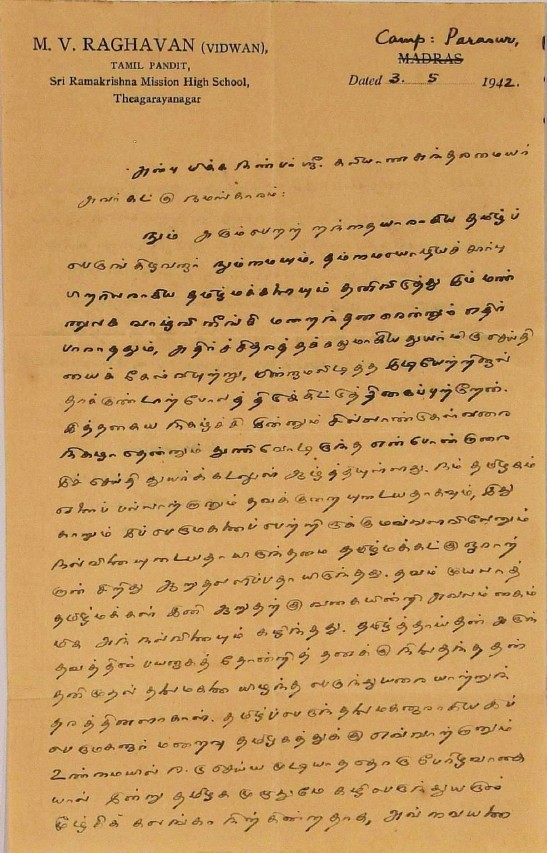 நன்றி மடல் : ஐயரின் உருவப்படம் அனுப்பியதற்கு நன்றிகூறும் மடல் ஆகஸ்டு 12, 1942