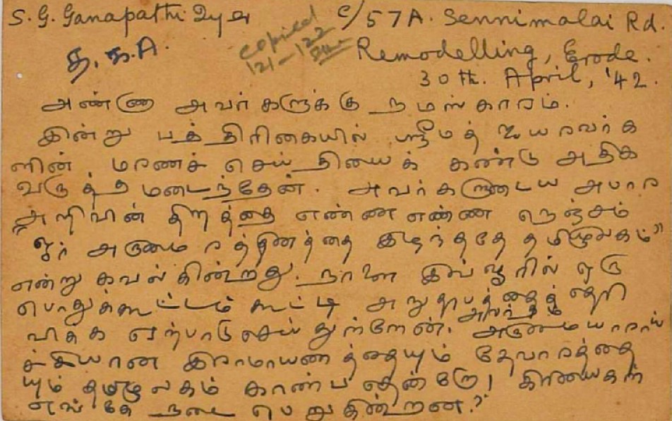 இரங்கல் மடல் : உ.வே.சாமிநாதையர் மறைவுக்கு இரங்கல் மடல் மே 4, 1942