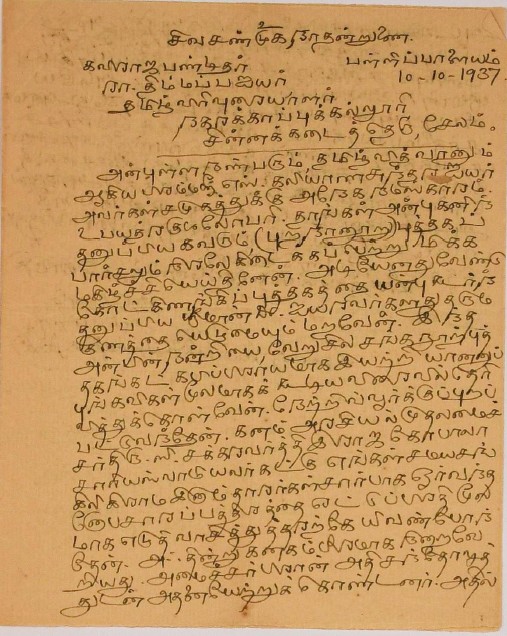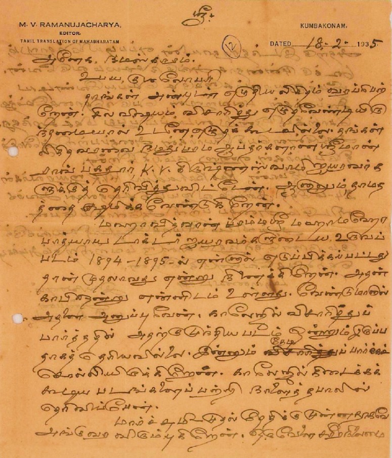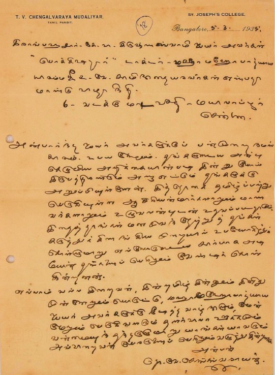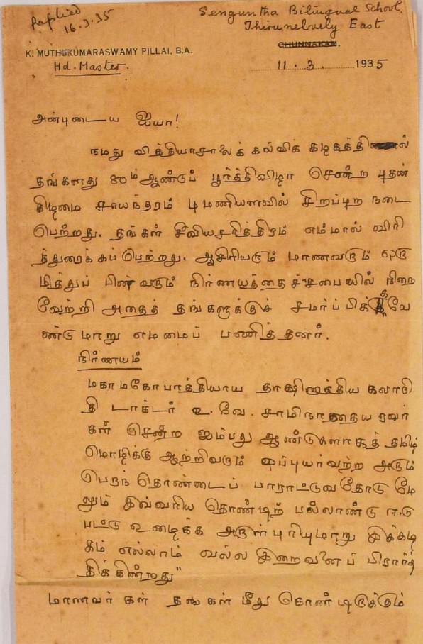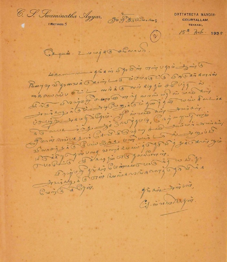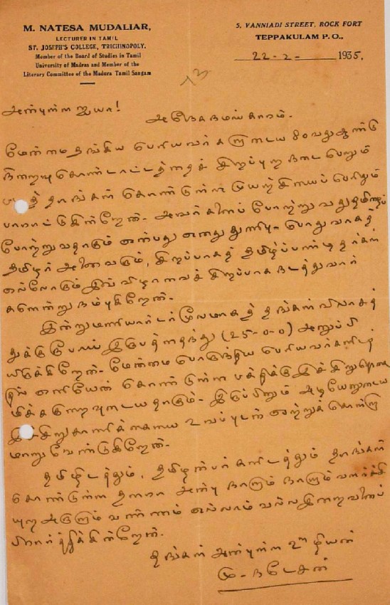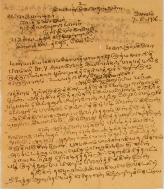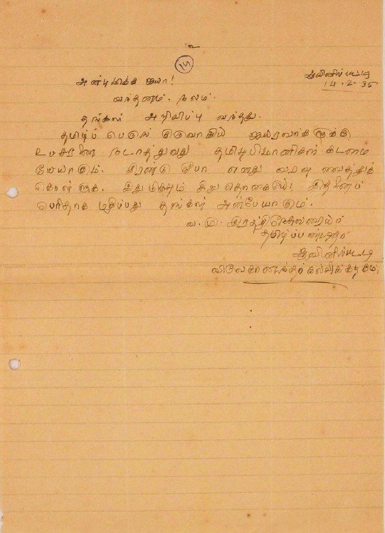 உ.வே.சா. பிறந்தநாள் விழா தொடர்பாக : உ.வே.சாமிநாதையரின் பிறந்த நாள் விழாவுக்கு நன்கொடை திரட்டுவது பற்றிய மடல் பிப்ரவரி 14, 1935