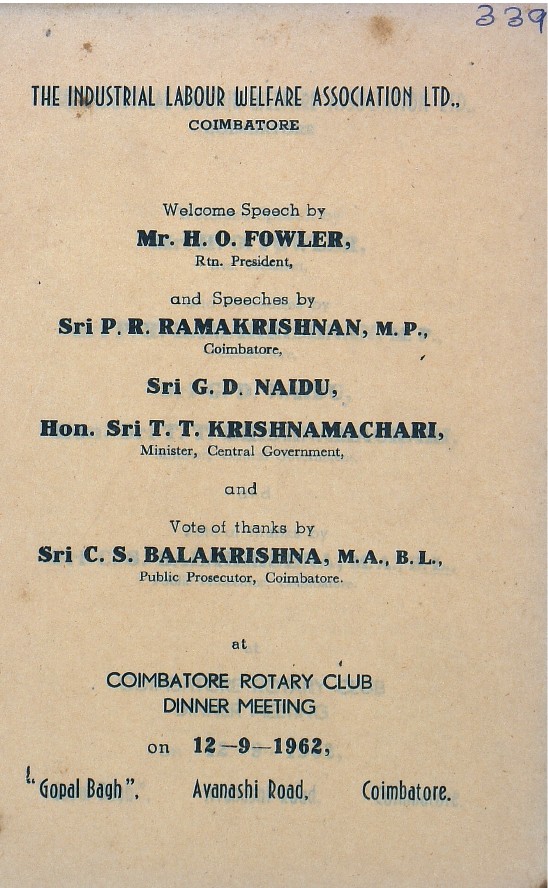 The Indian Chamber of Commerce, Coimbatore-Meeting held to felicitate Sri K. Sundaram on his departure to Foreign Countries on 18-9-1964 at Gopal Bagh, Coimbatore : speeches by T.V. Angappan, K. Sreenivasan, S.R.P. Ponnuswamy Chettiar, T.T.R. Pillai, K. Sundaram, G.D. Naidu and vote of thanks by M.S. Jagannatha Iyengar