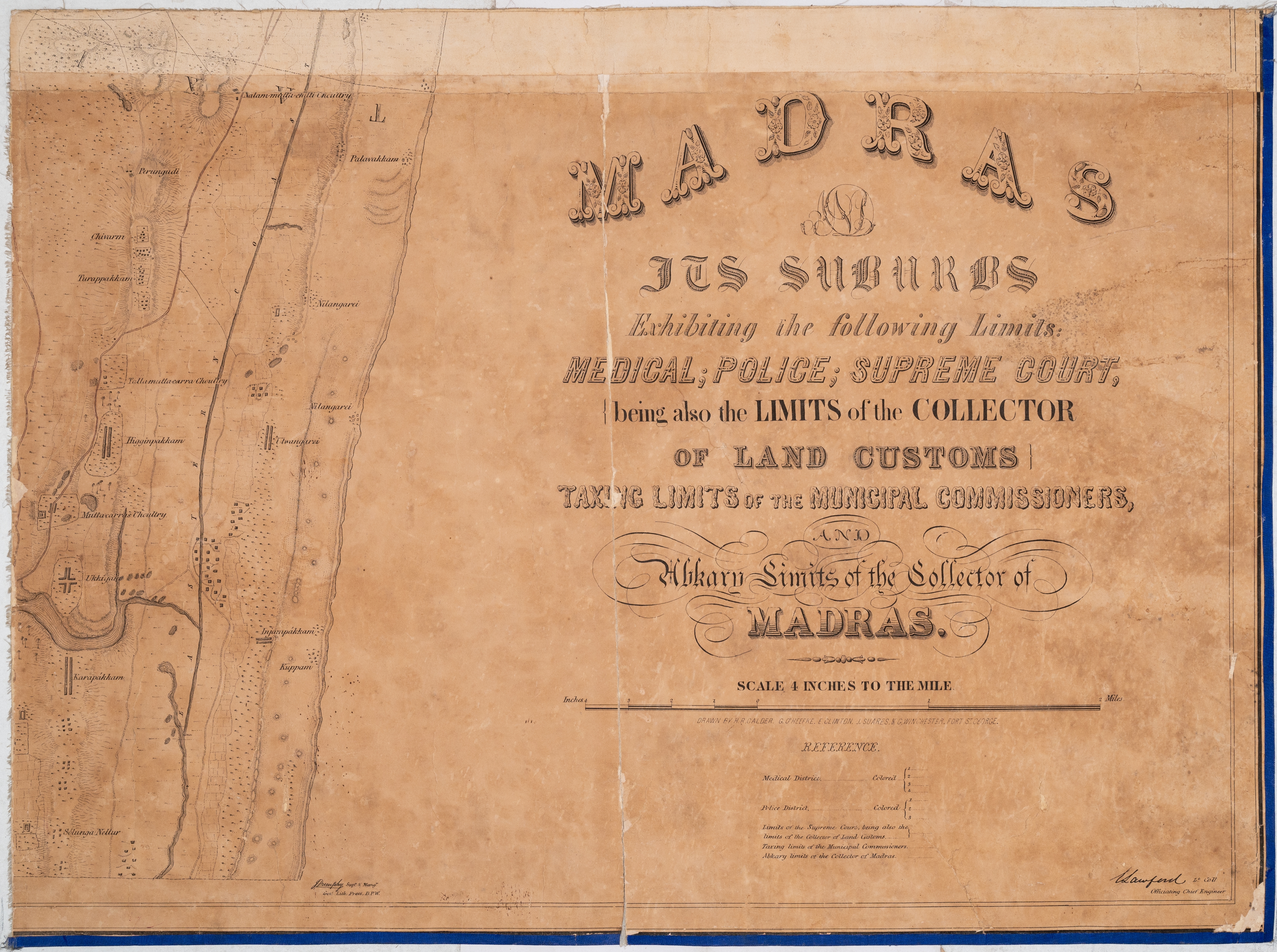 | பொதுவான குறிப்புகள் | Madras and its suburbs exhibiting the following limits medical, Police, Supreme court, being also the limits of the Collector of land customs taxing limits of the municipal commissioners and Abkary limits of the Collector of Madras |