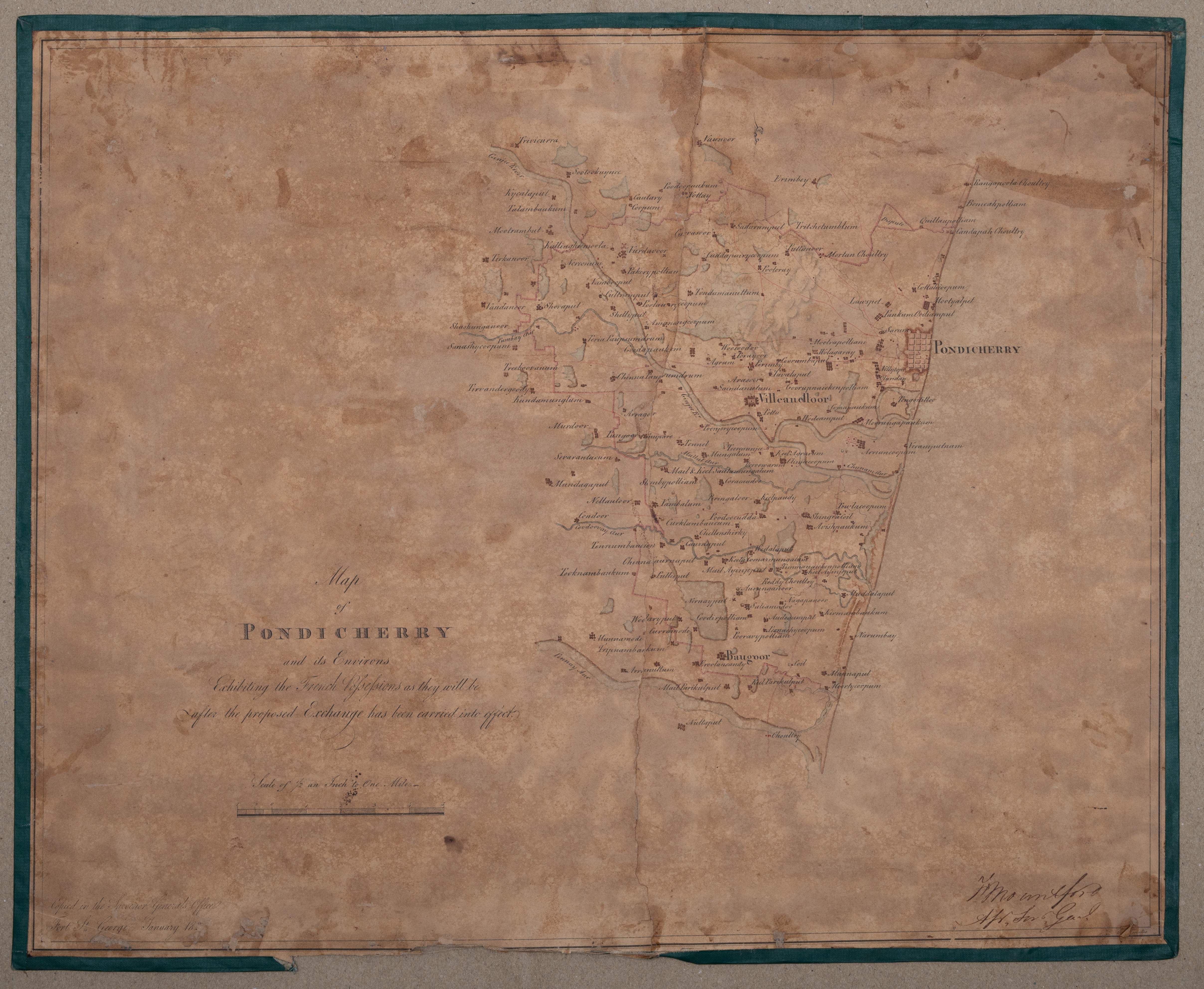 | பொதுவான குறிப்புகள் | Map of Pondicherry and its Environs Exhibiting the French Possessions as they will be after Proposed exchange has been carried into affect. |